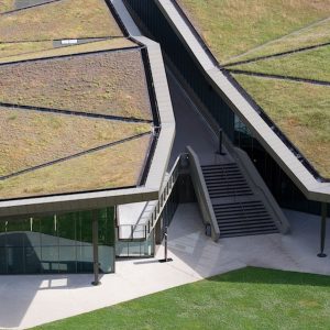 le relief de la toiture végétale et les facettes de ce grand auvent ont été pensés de manière à s’intégrer au site tout en s’adaptant aux volumes nécessaires des différentes salles. L’inertie et les grands débords de cette enveloppe protègent du soleil les salles d’exposition et de conservation.